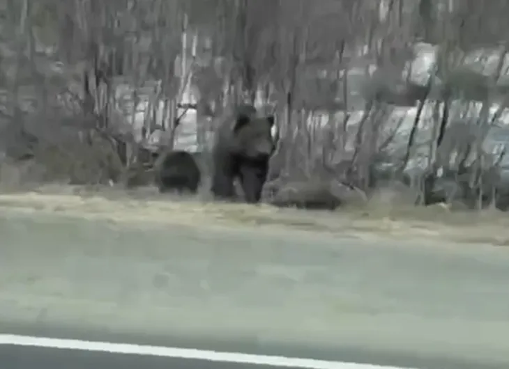 Под Нефтеюганском заметили медвежью семью — самка с медвежонком вышли прямо к дороге. Очевидцы сняли животных на видео: хищники осторожно осматривались, а проезжающие машины замедляли ход.