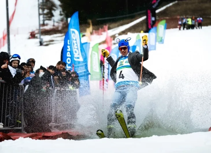 Главным событием стал костюмированный заезд: участники в необычных образах мчались с горы прямо в бассейн. Зрелище получилось эффектным и местами экстремальным — зрители явно не скучали.